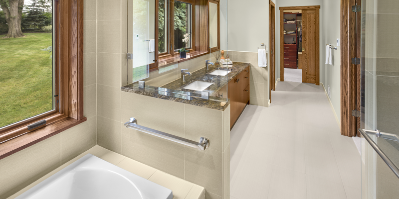 This bath design combined the space from two small bathrooms and two closets into one master bath suite with beautiful views into the surrounding wooded landscape. Now approximately 250 sq. ft., the suite includes a double vanity, spacious shower/bath area, a private water closet, and a large walk-in closet.