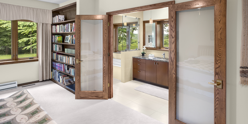 #5: Glue chip frosted glass for wall cabinets and sliding glass doors in the bar area to add interest and uniqueness.